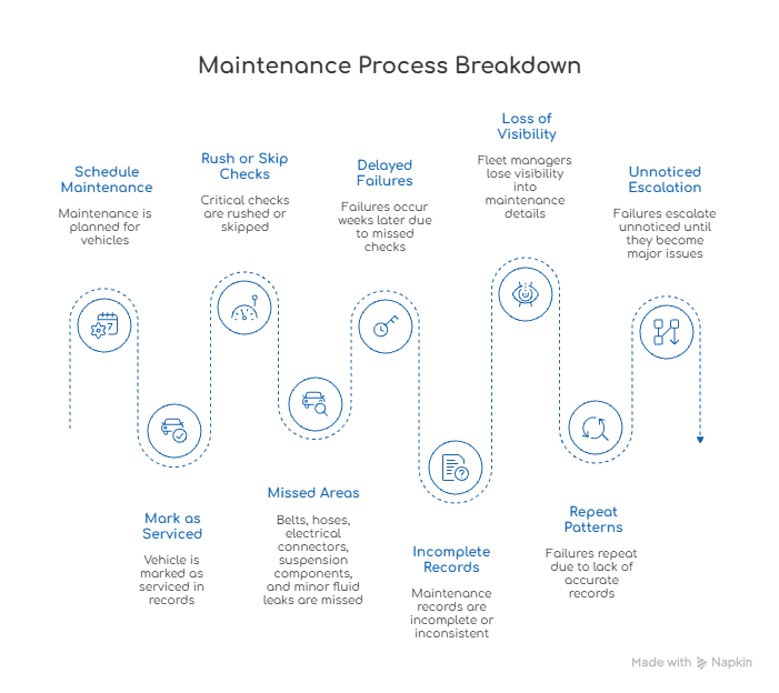 A vehicle may be marked as “serviced,” but critical checks can be rushed or skipped due to time pressure or workload.