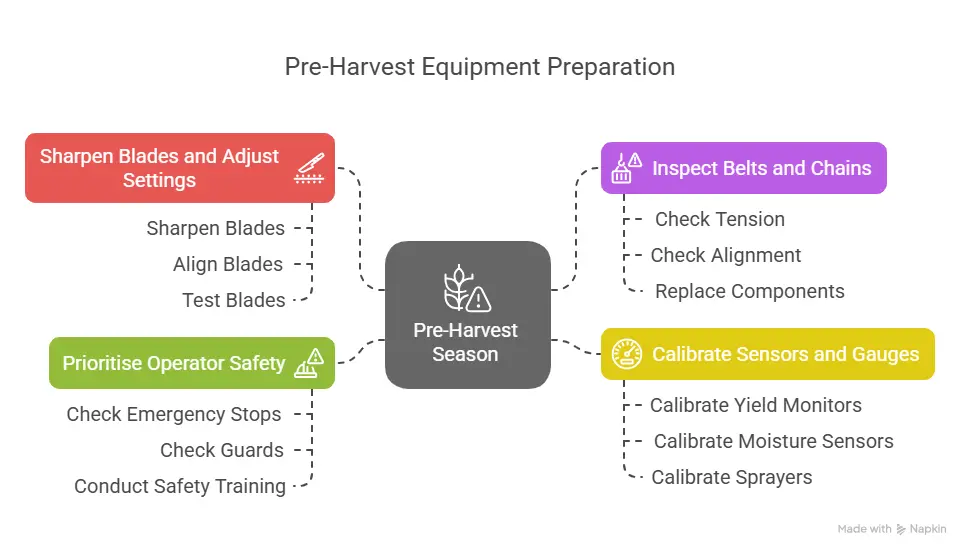 Before heading into the fields, run operational tests. Check hydraulics, control systems, and electrical functions. Fixing a problem in the shop is far less stressful (and costly) than repairing it mid-season.