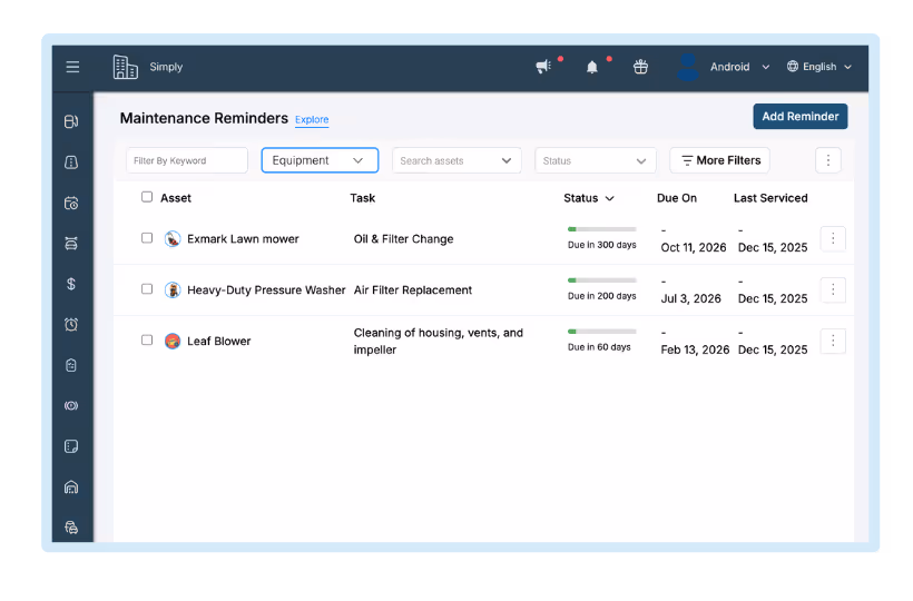 Absolutely. Simply Fleet supports preventive maintenance for tools, including reminders for oil changes, blade sharpening, filters, and seasonal care.